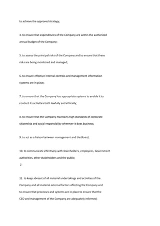 The Chief Executive Officer (CEO) is responsible for leading the development and execution of the company's long term strategy to create shareholder value. The CEO oversees all day-to-day management decisions and the implementation of long and short term plans. Key duties include developing strategy with the Board, organizing staff to achieve the strategy, ensuring compliance and effective risk management and controls, acting as liaison between the Board and management, and communicating with stakeholders. The CEO is also responsible for keeping informed about company activities and ensuring proper information flow to the Board.
