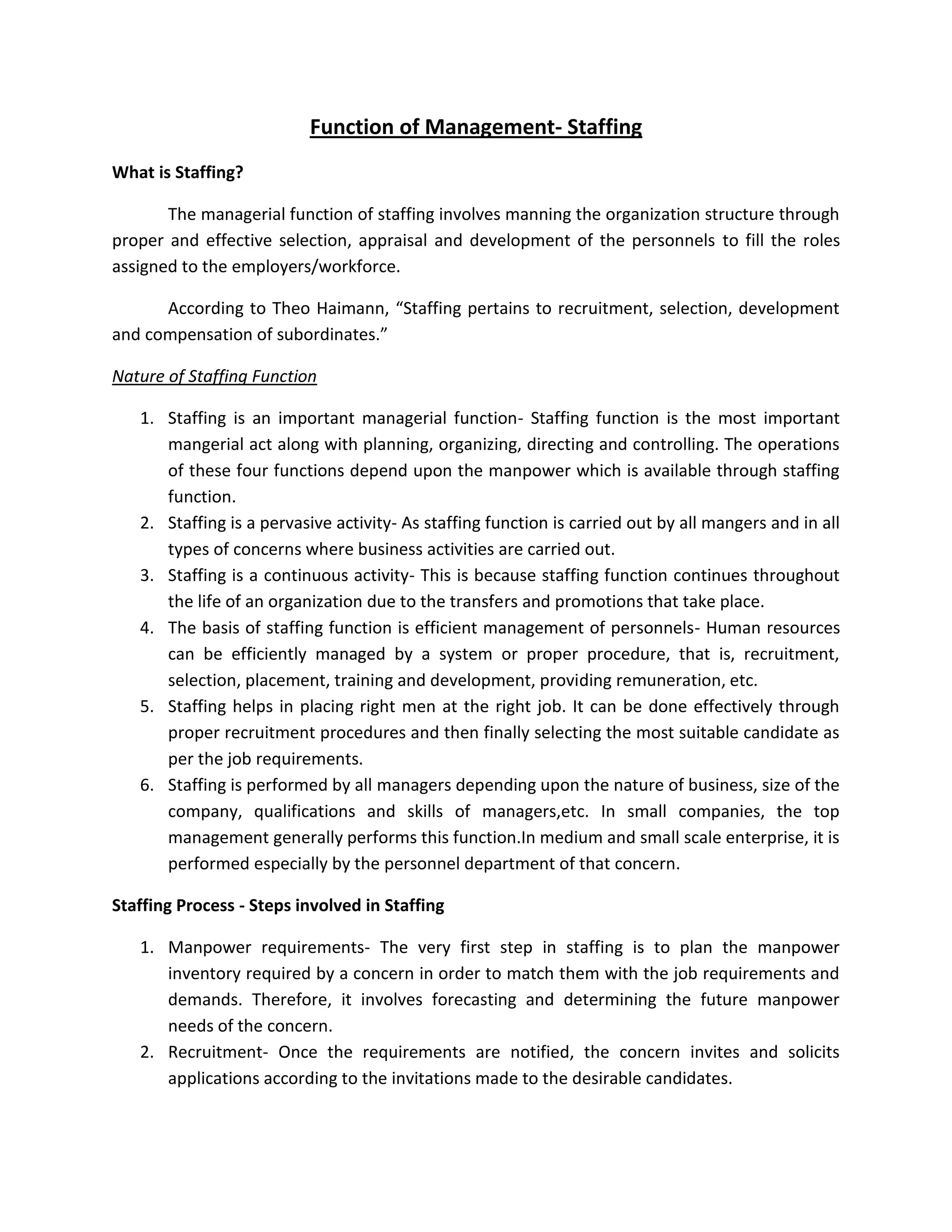The document discusses the staffing function of management. It begins by defining staffing and explaining that it involves selecting, assessing, and developing personnel to fill organizational roles. It then covers the nature, process, and importance of staffing. The key aspects are: