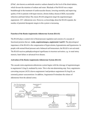 The Renin-Angiotensin-Aldosterone System (RAAS) is a hormone system that regulates blood pressure and fluid balance. It consists mainly of the hormones renin, angiotensin II, and aldosterone. Renin is released by the kidneys and cleaves angiotensinogen into angiotensin I. Angiotensin-converting enzyme then converts angiotensin I into the potent vasoconstrictor angiotensin II. Angiotensin II stimulates the release of aldosterone from the adrenal cortex and causes vasoconstriction, sodium retention, and increased blood pressure. Blocking this system is important for treating hypertension and other cardiovascular