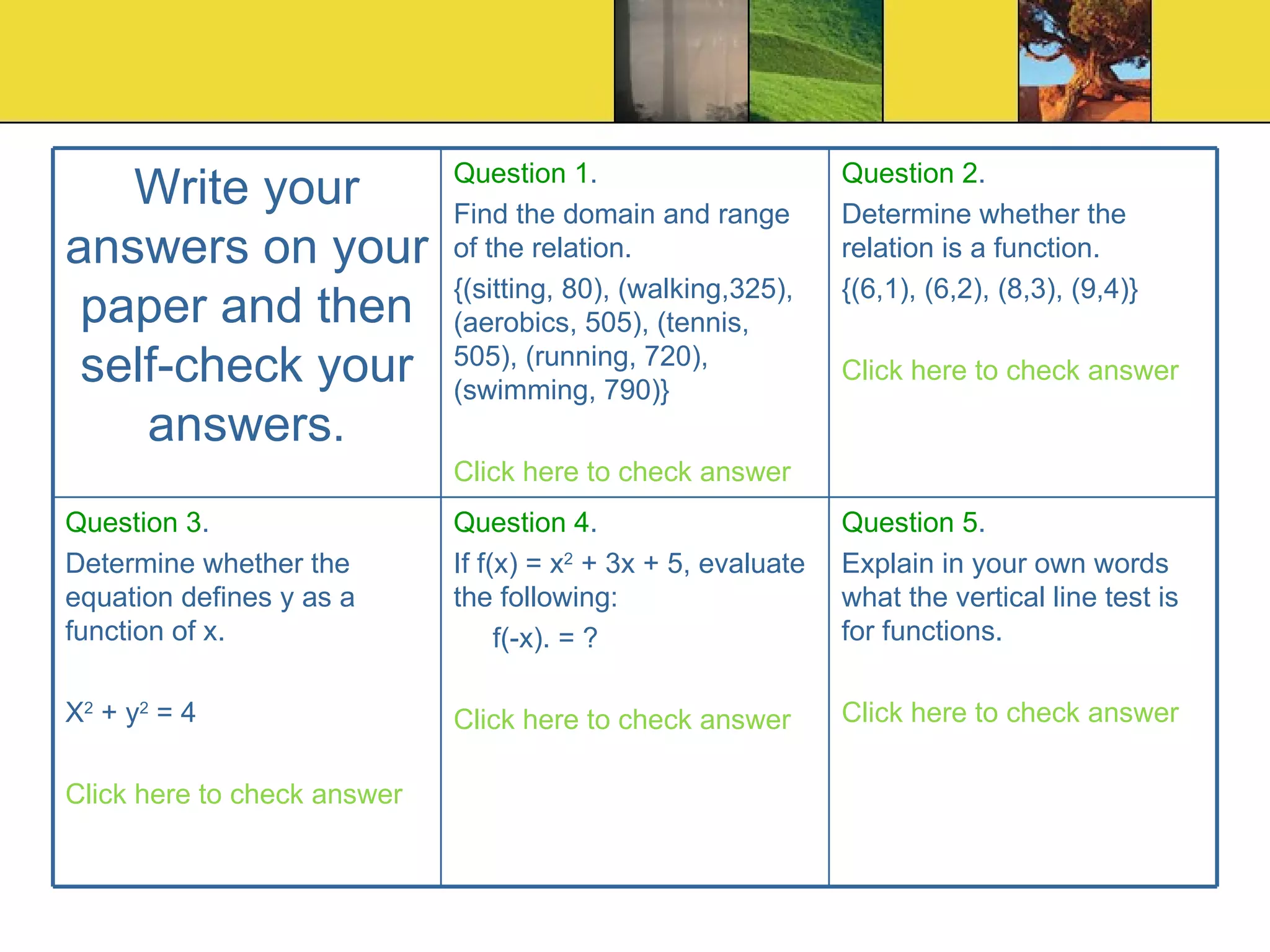 This document provides a 5 question quiz to review functions. Each question is multiple choice and provides the answer and an explanation. It tests understanding of domain and range, the vertical line test, determining if an equation defines a function, evaluating functions, and explaining the vertical line test. Upon completing the quiz, it congratulates the user and directs them to the next lesson on inverse functions.