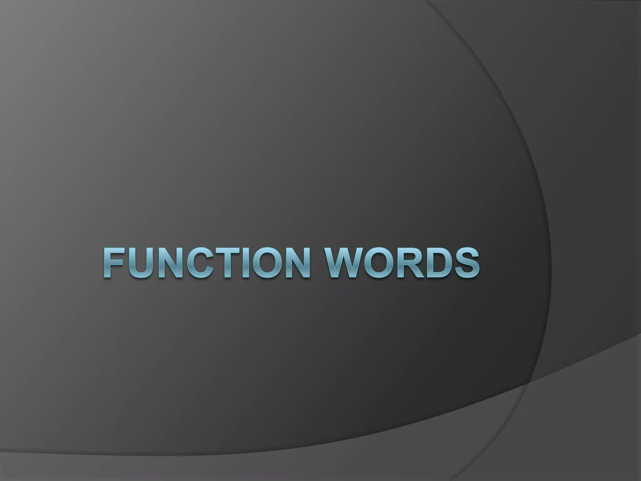 Function words serve important grammatical functions and have little meaning on their own. They include articles, auxiliary verbs, conjunctions, determiners, intensifiers, prepositions, pronouns, and interjections. Articles precede nouns and can be definite or indefinite. Auxiliary verbs combine with other verbs to form verb phrases. Conjunctions link words and phrases. Determiners introduce nouns. Pronouns replace nouns.