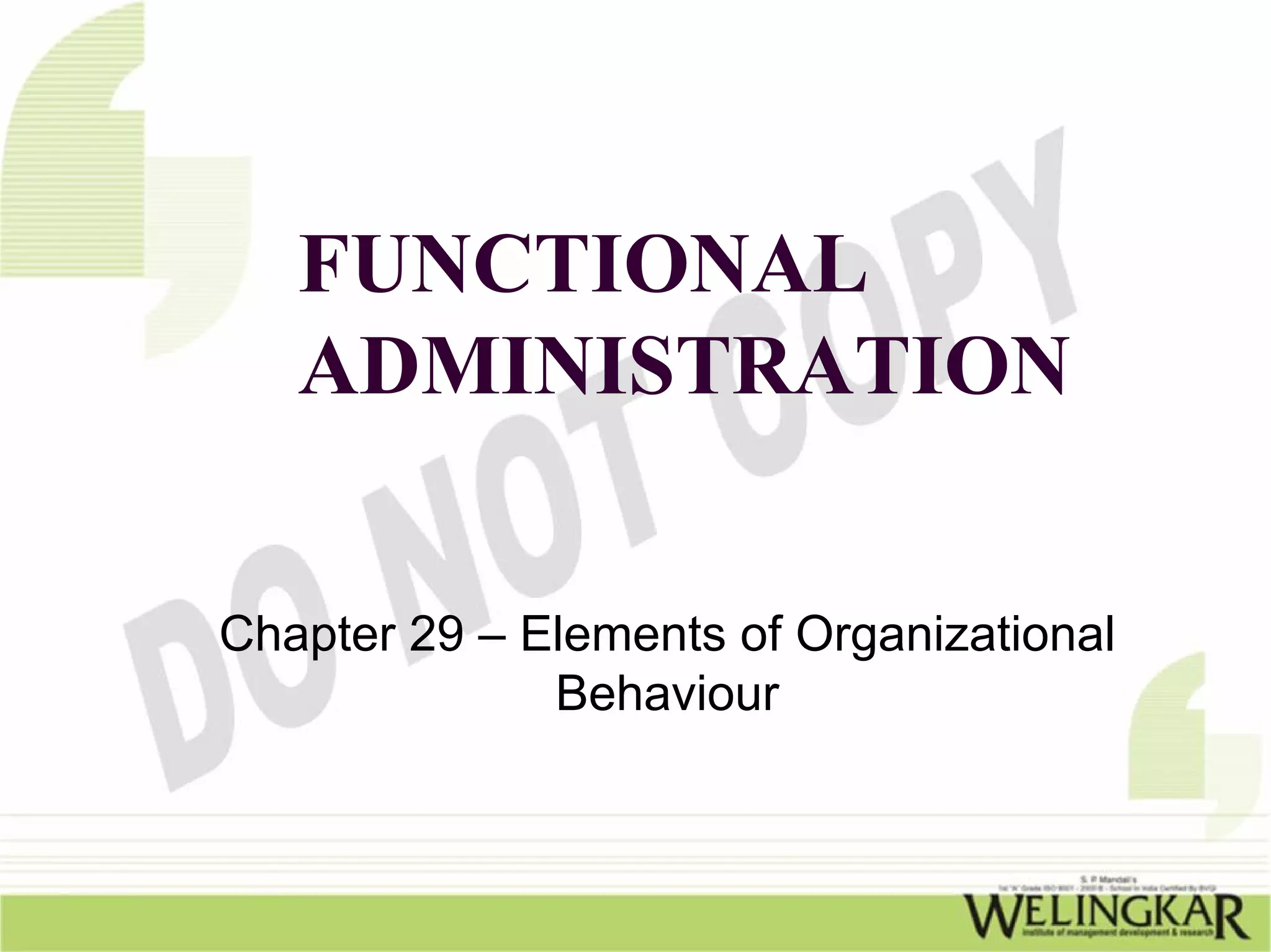 Chapter 29 of the document discusses elements of organizational behavior, emphasizing the importance of understanding human behavior at work, including perceptions, communication styles, motivation, and group dynamics. Key concepts include the influence of personality, the impact of leadership, and the role of attitudes and job satisfaction on performance. It also addresses methods of persuasion, coercion, teamwork, and the effects of cohesiveness and determination in achieving organizational goals.