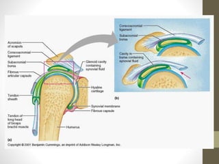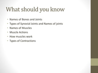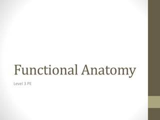 This document provides an overview of functional anatomy and the musculoskeletal system. It discusses the key structures including bones, joints, muscles, planes of movement, and anatomical terminology. Bones provide structure, protection and movement. The 206 bones in the human body are divided into the axial skeleton along the midline and appendicular skeleton in the limbs. Synovial joints allow movement and are connected by ligaments and tendons. Muscles have three main functions - movement, posture and heat production - and are either skeletal, cardiac or smooth muscle. Skeletal muscle is composed of striated muscle fibers that run from origin to insertion points.