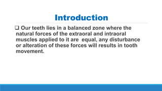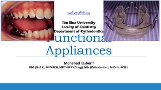 This document provides an overview of functional orthodontic appliances. It begins by explaining that orthodontic appliances can be either removable, fixed, or functional. Functional appliances work by utilizing forces from the muscles rather than having an active component themselves. They are often removable and used to treat Class II and Class III malocclusions in growing patients. Common functional appliances discussed include lip bumpers, oral screens, twin blocks, Andresen activators, Bionators, Herbst appliances, and Frankel regulators. The document concludes by discussing considerations for choosing a functional appliance and their management.