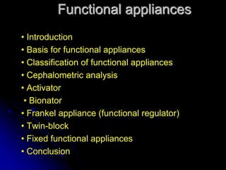 This document provides an overview of functional appliances used in orthodontic treatment. It begins with an introduction to functional appliances and their use in guiding natural forces to correct morphological abnormalities. It then covers classifications of functional appliances, how cephalometric analysis is used to assess patients, and descriptions of common appliances like the activator, bionator, and twin-block. The document discusses how functional appliances can correct Class II and III malocclusions by influencing facial growth. In under 3 sentences.