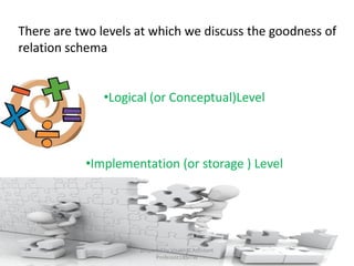 The document discusses functional dependencies and their importance in relational schema design, highlighting measures of schema quality and various levels of normal forms. It explains concepts such as minimal cover, Armstrong's inference rules, and the implications of different normal forms (1NF, 2NF, 3NF, BCNF, 4NF, and 5NF) on database structures. Additionally, it addresses the issues related to redundancy, anomalies, and the conditions under which certain functional and multivalued dependencies hold.