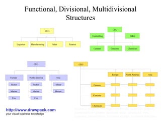Functional, Divisional, MultidivisionalStructures http://www.drawpack.com your visual business knowledge business diagram, management model, business graphic, powerpoint templates, business slide, download, free, business presentation, business design, business template Logistics Manufacturing Sales Finance CEO CEO Cement Concrete Chemicals R&D Controlling CEO Europe Asia Motor Marine North America Motor Marine Fire Motor Marine Fire CEO Europe North America Asia Cement Concrete Chemicals