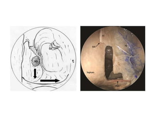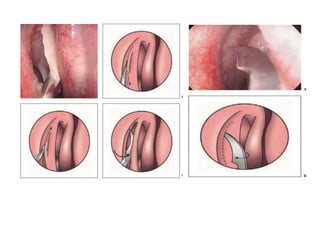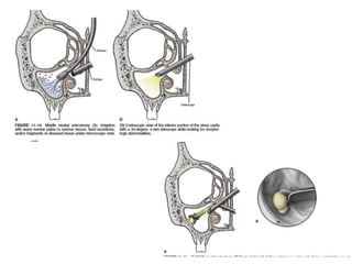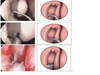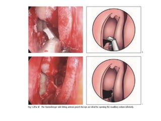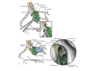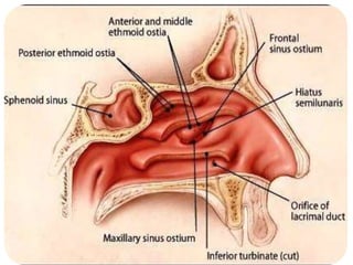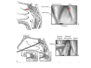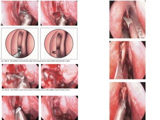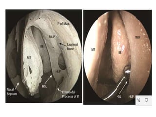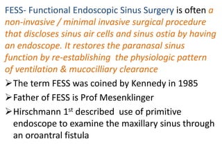 The document discusses Functional Endoscopic Sinus Surgery (FESS). FESS is a minimally invasive procedure that uses an endoscope to access and treat the paranasal sinuses. It aims to restore sinus function by re-establishing ventilation and mucociliary clearance. Key steps in FESS include uncinectomy to remove the uncinate process, maxillary antrostomy to access the maxillary sinus, and ethmoidectomy to access the ethmoid sinuses. Proper identification of anatomical landmarks like the middle turbinate, uncinate process, and bulla ethmoidalis is important for successful FESS.
