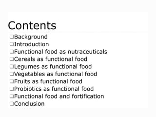 This document discusses functional foods and nutraceuticals. It defines functional foods as foods that provide additional health benefits beyond basic nutrition. Cereals, legumes, vegetables, fruits, and probiotics are described as examples of functional foods. Cereals provide fiber, vitamins, minerals and antioxidants that can help prevent cancer, heart disease and other conditions. Legumes contain proteins, fibers and phytochemicals like isoflavones and saponins that may lower cholesterol and blood glucose. Vegetables and fruits are rich in antioxidants, vitamins and minerals that promote health. Probiotics in foods like yogurt contain beneficial bacteria and may help lower blood pressure and reduce risk of obesity and other diseases.