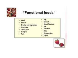 This document discusses various functional foods and their health benefits. It begins by defining functional foods as foods that provide health benefits beyond basic nutrition. The history of functional foods is then summarized, noting that Japan first established a definition for these foods in 1991. Several categories of functional foods are then listed, including those fortified with vitamins/minerals, containing cholesterol-reducing components, and probiotics/prebiotics. Specific examples like yogurt, fruits and vegetables are given. Methods for how foods can become functional are outlined, such as by adding or increasing beneficial components. The roles and health benefits of various functional food categories are then summarized in 1-2 sentences each, including dairy products like milk and yogurt, seafood rich in omega