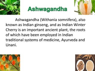 The document discusses the properties and uses of Ashwagandha and Aloe Vera in traditional Indian medicine. Ashwagandha contains various alkaloids, steroidal lactones, and saponins and has been used to enhance memory, stabilize mood, improve learning ability, and treat Parkinson's and Alzheimer's disease. It may also help with conditions like hypoxia, catalepsy, and bipolar disorder. Aloe Vera contains components that promote wound healing and skin protection. It has been used topically to treat pimples, soothe skin, and relieve joint and muscle pain.