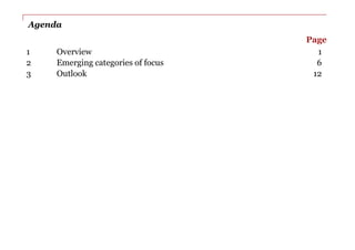 The document provides an overview of the functional foods and beverages market in India. It notes that the market has doubled in size over the past 6 years to INR 132 billion in 2011. Key growth segments include energy drinks, dairy products, and confectionery. The outlook expects continued strong growth of around 10% annually to INR 192 billion by 2015. Emerging categories that could drive future growth are discussed as anti-aging foods, Ayurceuticals (Ayurvedic nutraceuticals), and novel foods. Convergence between the pharmaceutical and food industries is also highlighted through the emergence of "Pharma Foods."