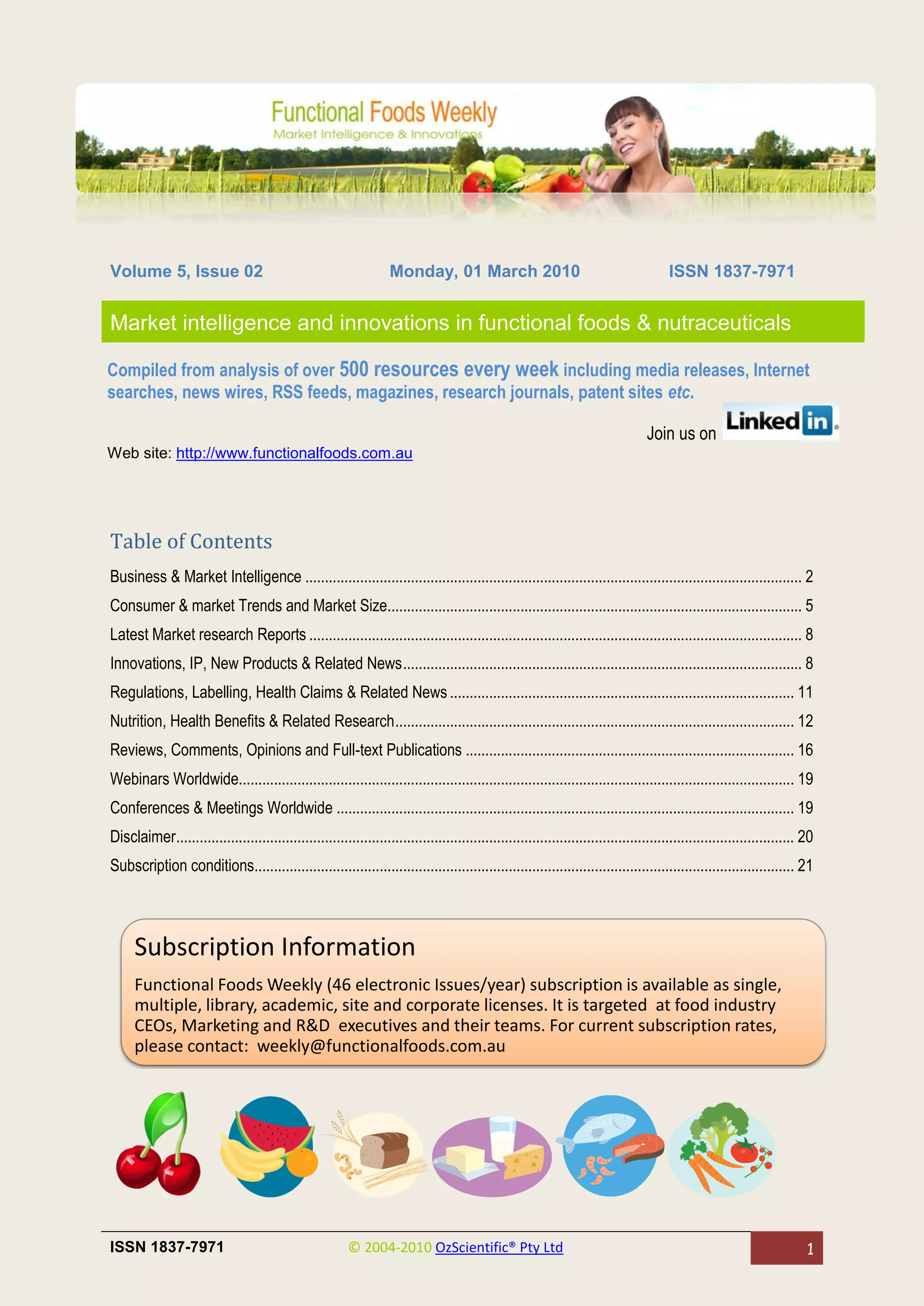 This document is a newsletter from Functional Foods Weekly dated March 1, 2010 that provides information on functional foods and nutraceuticals. It includes sections on business and market intelligence, consumer trends and market sizes, new products, regulations, research, and conferences. Some of the articles summarized include Dannon paying $45 million to settle a yogurt lawsuit over unproven health claims, Biogaia reporting a profit for 2009, BioGaia signing an agreement with a Japanese distributor, and Carrefour announcing job cuts and store closures in Belgium.