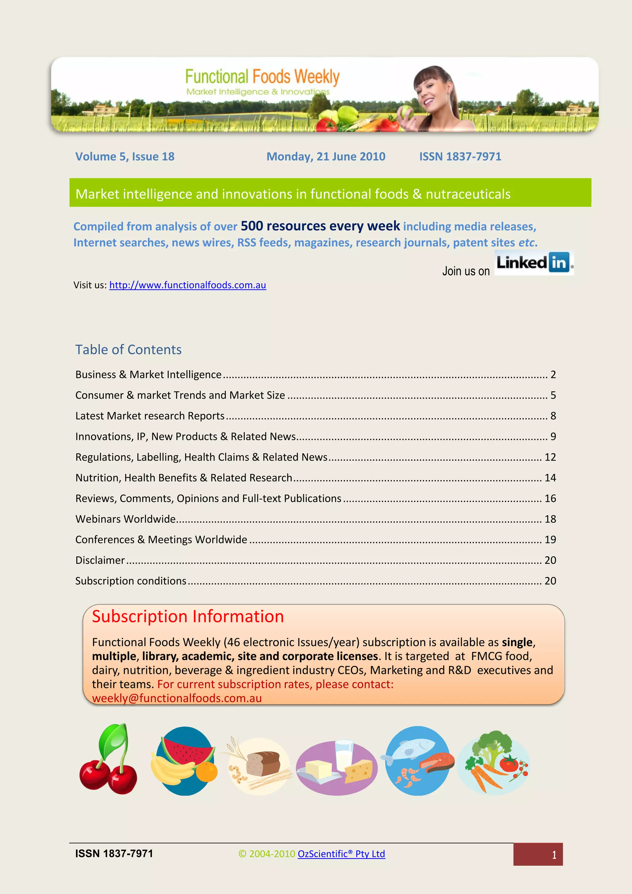The document provides a summary of news and information related to the functional foods and nutraceuticals industry. It includes the following highlights: