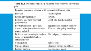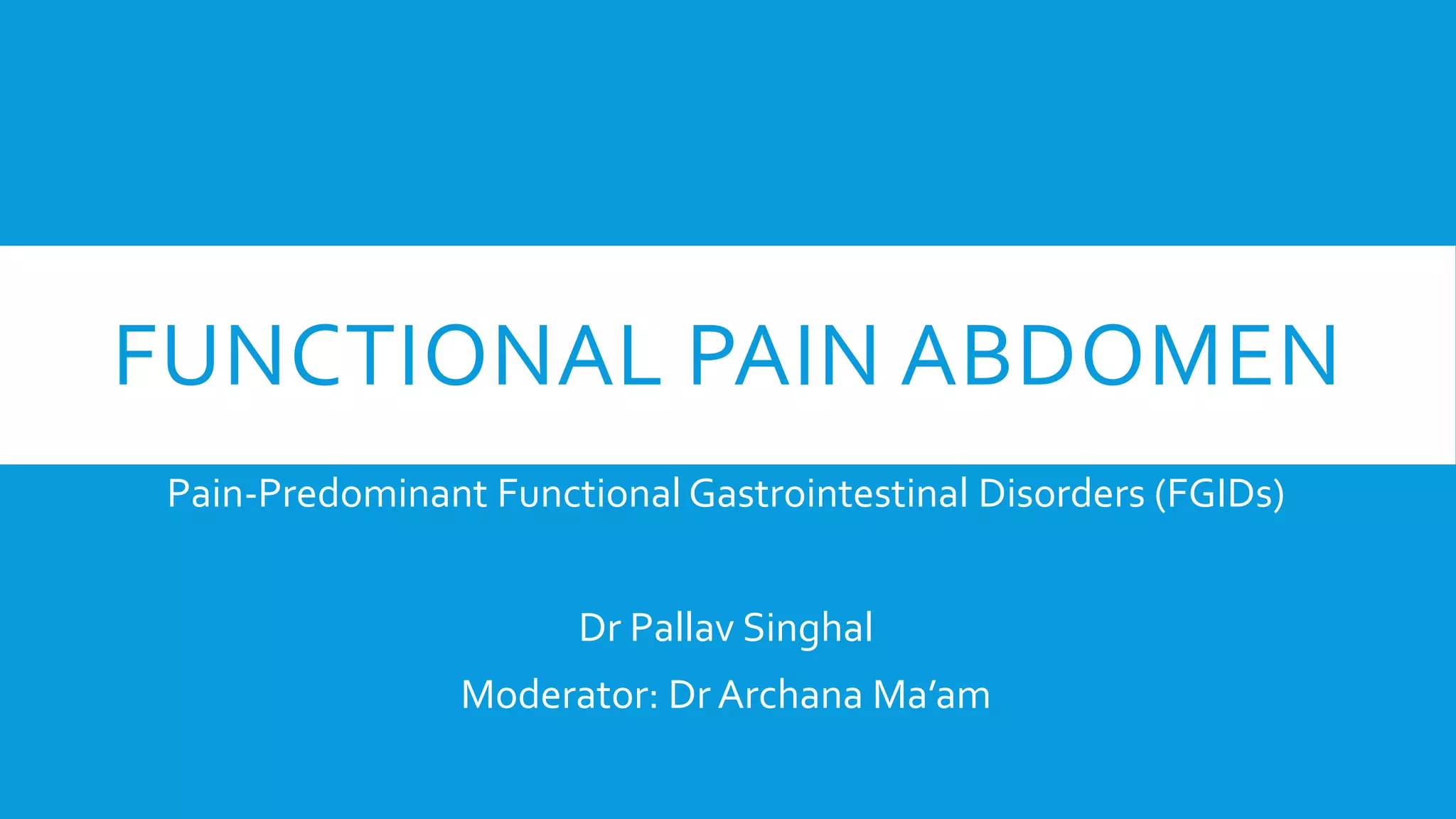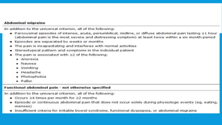 The document discusses functional gastrointestinal disorders (FGIDs), specifically focusing on abdominal pain disorders such as recurrent abdominal pain, chronic abdominal pain, and functional abdominal pain. It outlines their definitions, prevalence, causes, pathophysiology, differential diagnoses, management strategies, and relevant diagnostic criteria. The document highlights the importance of individualized patient care, symptomatic management, and regular follow-up to improve quality of life in affected individuals.