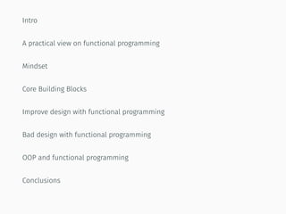 The document discusses functional programming in C++, emphasizing its principles such as immutability, pure functions, and data transformations, contrasting it with traditional object-oriented programming. It also highlights the advantages of using functional programming in code design, advocating for practices like avoiding side effects and leveraging higher-order functions for cleaner and more maintainable code. The author shares practical examples and concludes that a functional programming mindset can greatly improve software design, especially in data-centric applications.