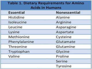 This document discusses functional proteins, which are proteins that perform specific functions in the body beyond just structural roles. It provides examples of different types of functional proteins like enzymes, hormones, hemoglobin, and antibodies. It also discusses sources of proteins from foods like wheat, corn, fish, eggs, yogurt and classifies proteins as either complete or incomplete based on their amino acid content. Combining different plant and animal protein sources can create complete proteins that provide all essential amino acids.