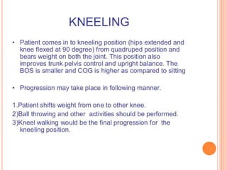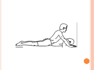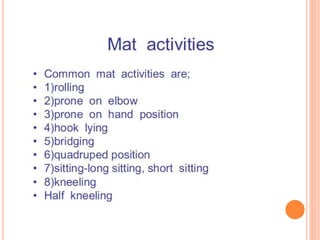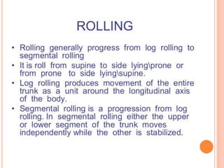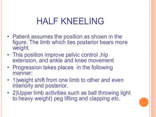Functional re-education aims to retrain patients' movements and activities that they already know but cannot properly perform due to illness or injury. The goal is to increase independence through a tailored program of progressive exercises. Exercises may include rolling, sitting, kneeling, standing, and walking activities. Principles include thorough assessment, task-specific treatment, and avoiding discouragement to build confidence and independence over time.