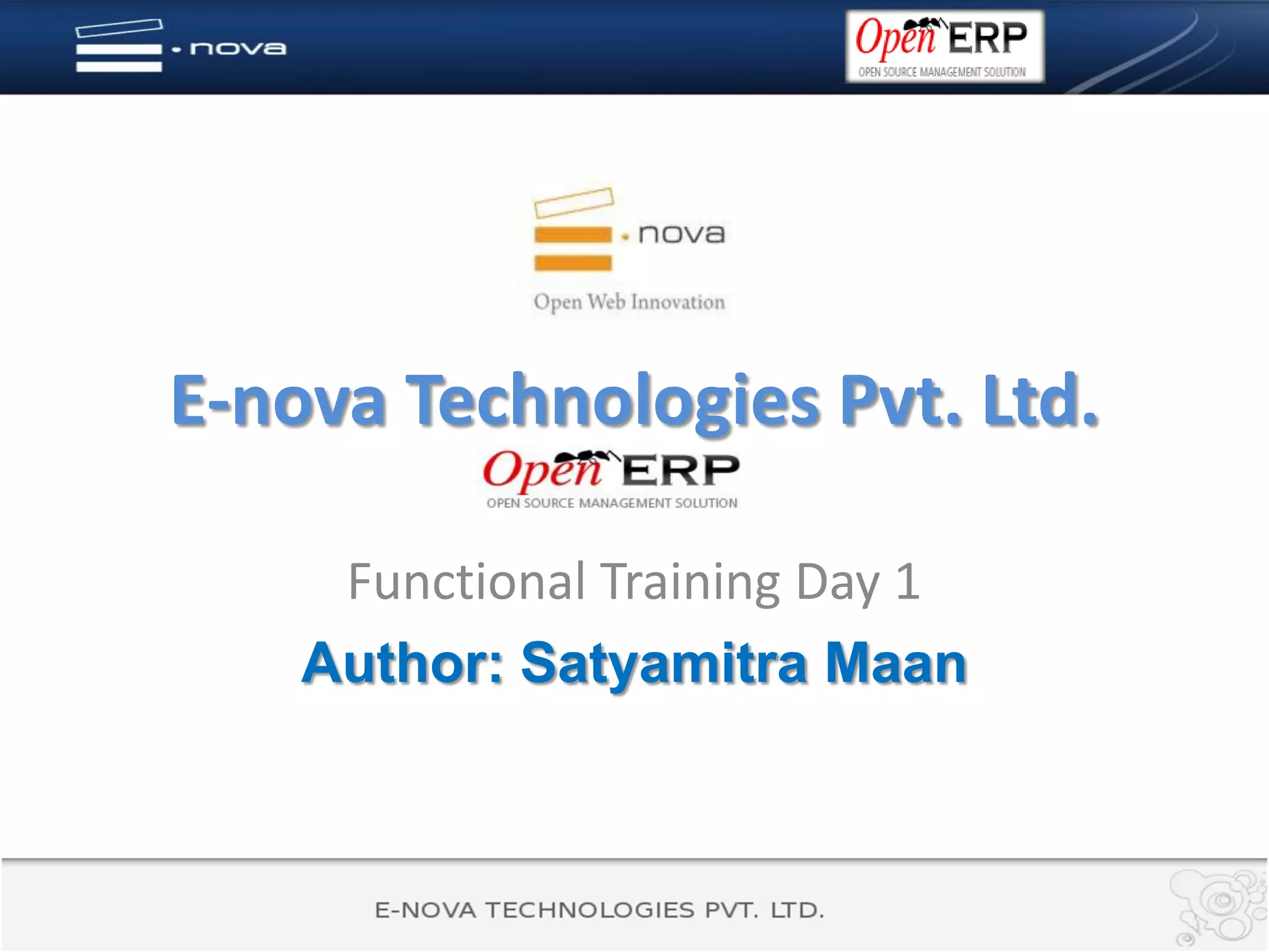 The document provides an overview of functional training for Open ERP installation and use. It introduces Open ERP as an open-source ERP solution, discusses installing Open ERP on Ubuntu, and provides a guided tour of key Open ERP features like database creation, user configuration, and installing new modules. The training aims to familiarize users with the Open ERP interface using demonstration data.