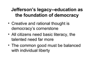 American schools are struggling with expanding expectations, contradictions in cultural values, and persistent inequalities. Functionalism views schools as contributing to social stability by transmitting social norms and values, and preparing students for their future roles in society's division of labor. However, conflict theory argues that schools reinforce existing social inequalities and serve the interests of elite groups rather than achieving a true consensus. Schools may claim to provide equal opportunities, but factors like class, race and gender still influence student outcomes.