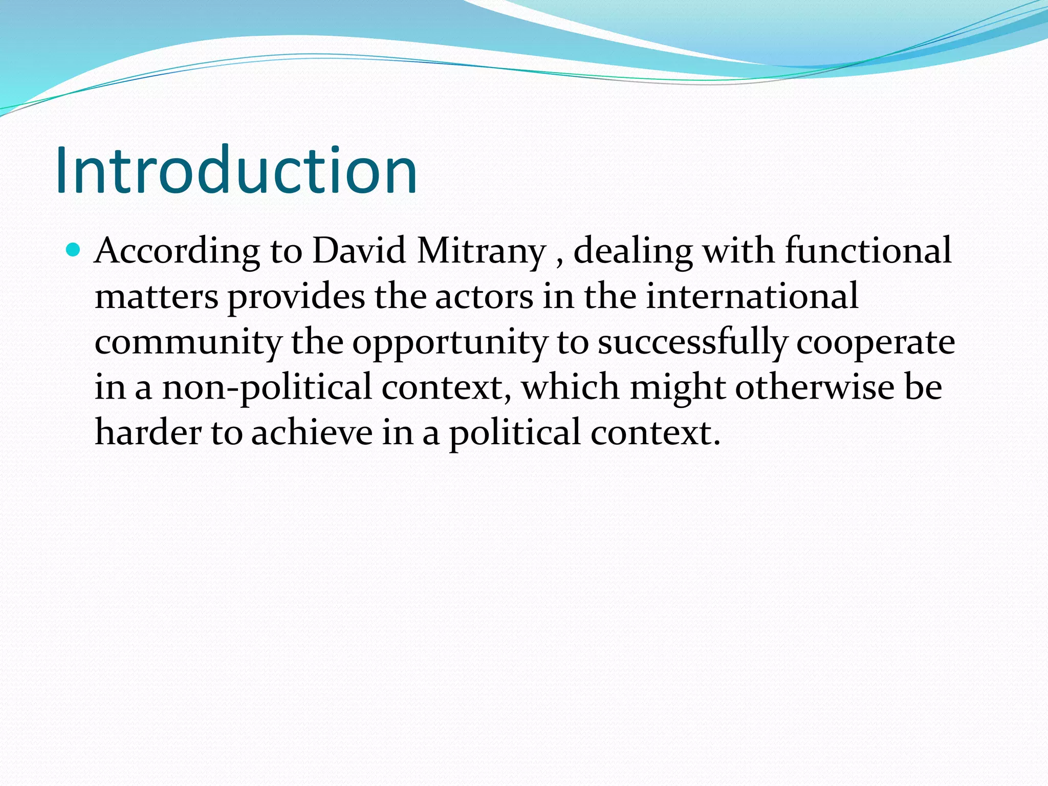 Functionalism proposes that international cooperation through non-political, technical organizations in areas like health, transportation, and economic issues can help reduce conflicts between states and lead to greater international integration and potentially an international government. It argues that addressing common problems through functional cooperation will increase interdependence and spill over into greater and deeper integration. While functionalism aims to build authority based on needs rather than politics, neo-functionalism focuses on regional integration and the momentum of integration spreading across issues over time through spill-over effects.
