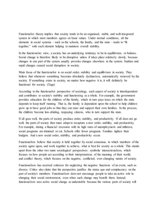 The document outlines the major theoretical perspectives in sociology, focusing on the functionalist perspective, which views society as a complex system where various parts work together to maintain stability and order. It highlights the contributions of key sociologists like Herbert Spencer and Emile Durkheim, emphasizing the importance of social institutions and their functions in achieving social cohesion. The perspective also acknowledges criticisms, such as its tendency to overlook negative functions and discourage active social change.