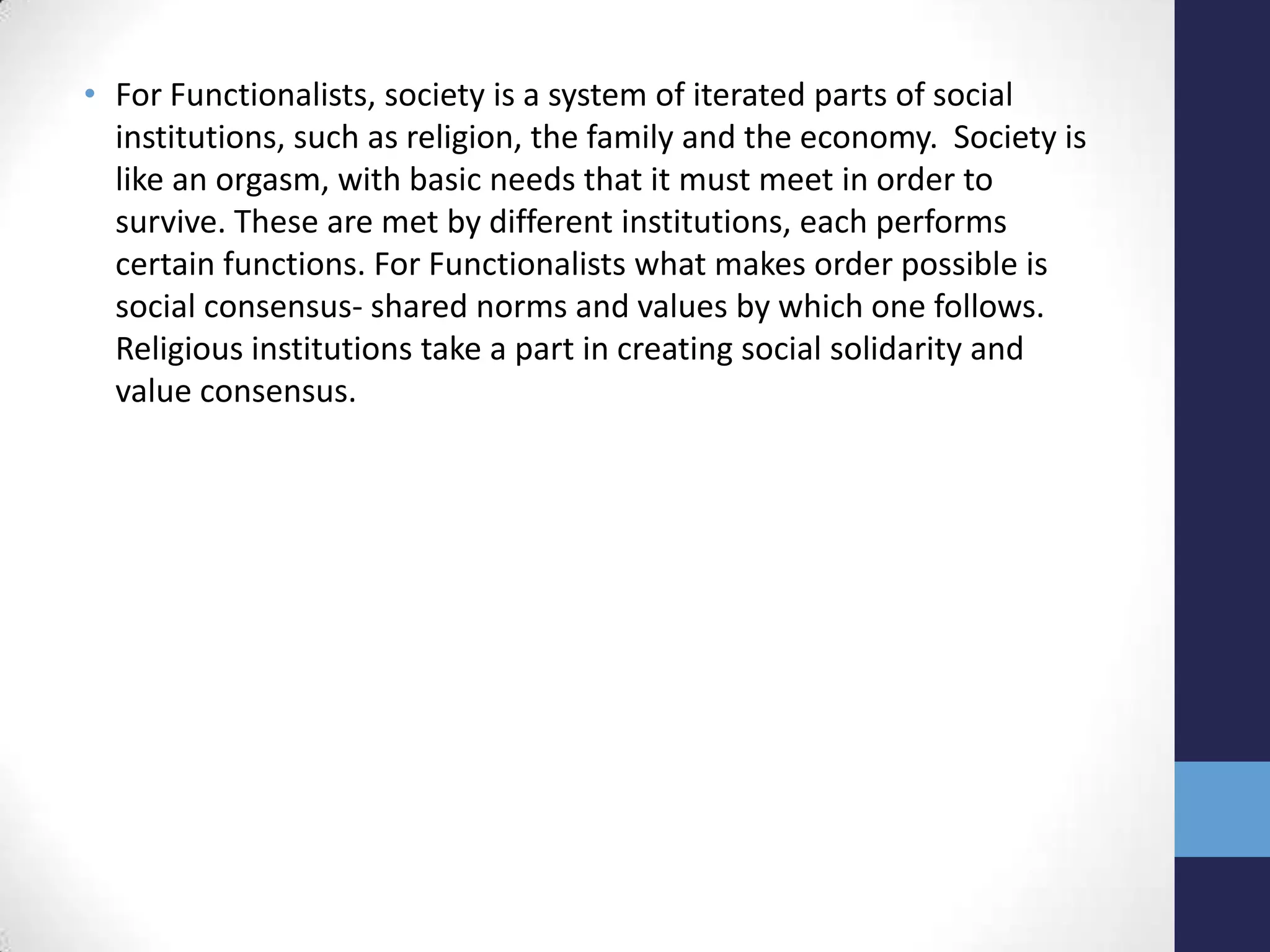 Functionalist theories view religion as a crucial institution that fosters social solidarity and consensus, with Durkheim emphasizing the distinction between the sacred and the profane. He argues that rituals around sacred symbols unite individuals into a moral community, while religion also provides cognitive functions essential for reasoning and understanding. Critics highlight limitations in applying functionalist concepts to diverse and modern societies, where religion can also be a source of conflict and oppression.