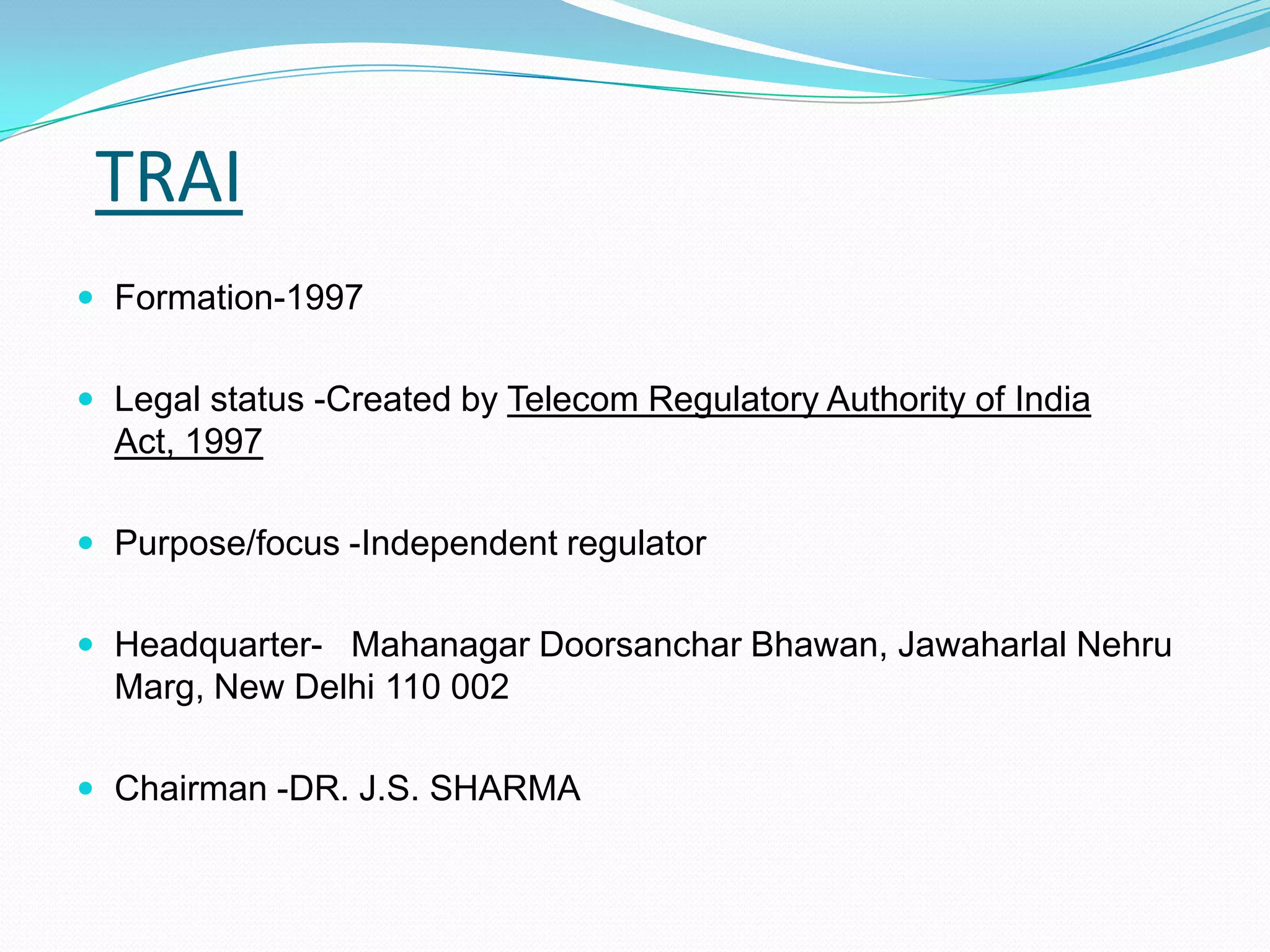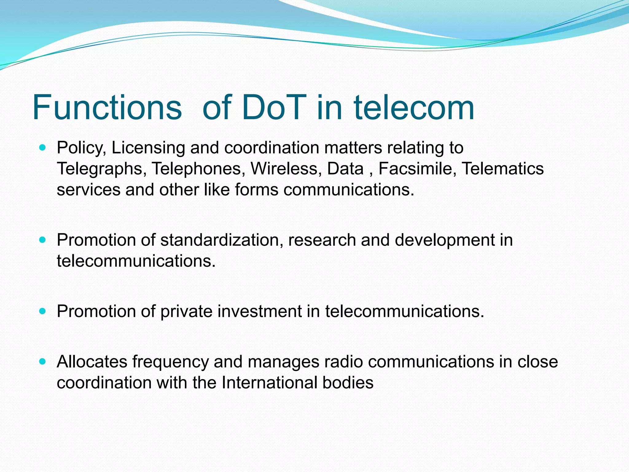 This document discusses the roles and functions of the key regulatory bodies that govern India's telecommunications sector - the Department of Telecommunications (DoT), the Telecom Regulatory Authority of India (TRAI), and the Telecom Disputes Settlement and Appellate Tribunal (TDSAT). It provides an overview of each organization, including that DoT manages licensing and spectrum, TRAI provides recommendations and regulates the sector as an independent body, and TDSAT handles disputes. The document also outlines some of the specific regulatory and recommendatory functions of these organizations in shaping policy and dispute resolution in India's large and rapidly growing telecom industry.