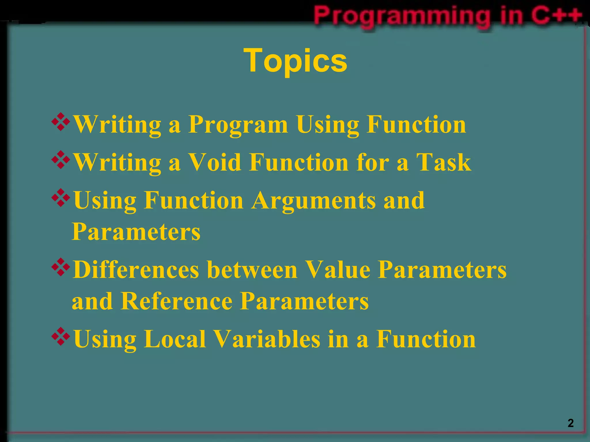 Functions allow programmers to organize code into reusable blocks and improve modularity. A function is called by specifying its name followed by parentheses that may contain arguments. Functions communicate through parameters and arguments, which can be passed by value or by reference. Functions in C++ must be declared with a prototype or definition so the compiler knows the function exists before it is called.