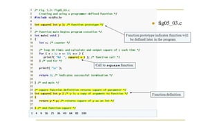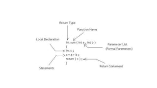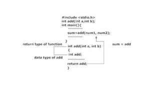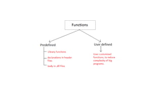 This document discusses functions in C programming. It defines functions as blocks of code that perform specific tasks. It explains the key components of functions - function declaration, definition, and call. It provides examples of defining, declaring, and calling functions. It also discusses recursion, system-defined library functions, and user-defined functions.