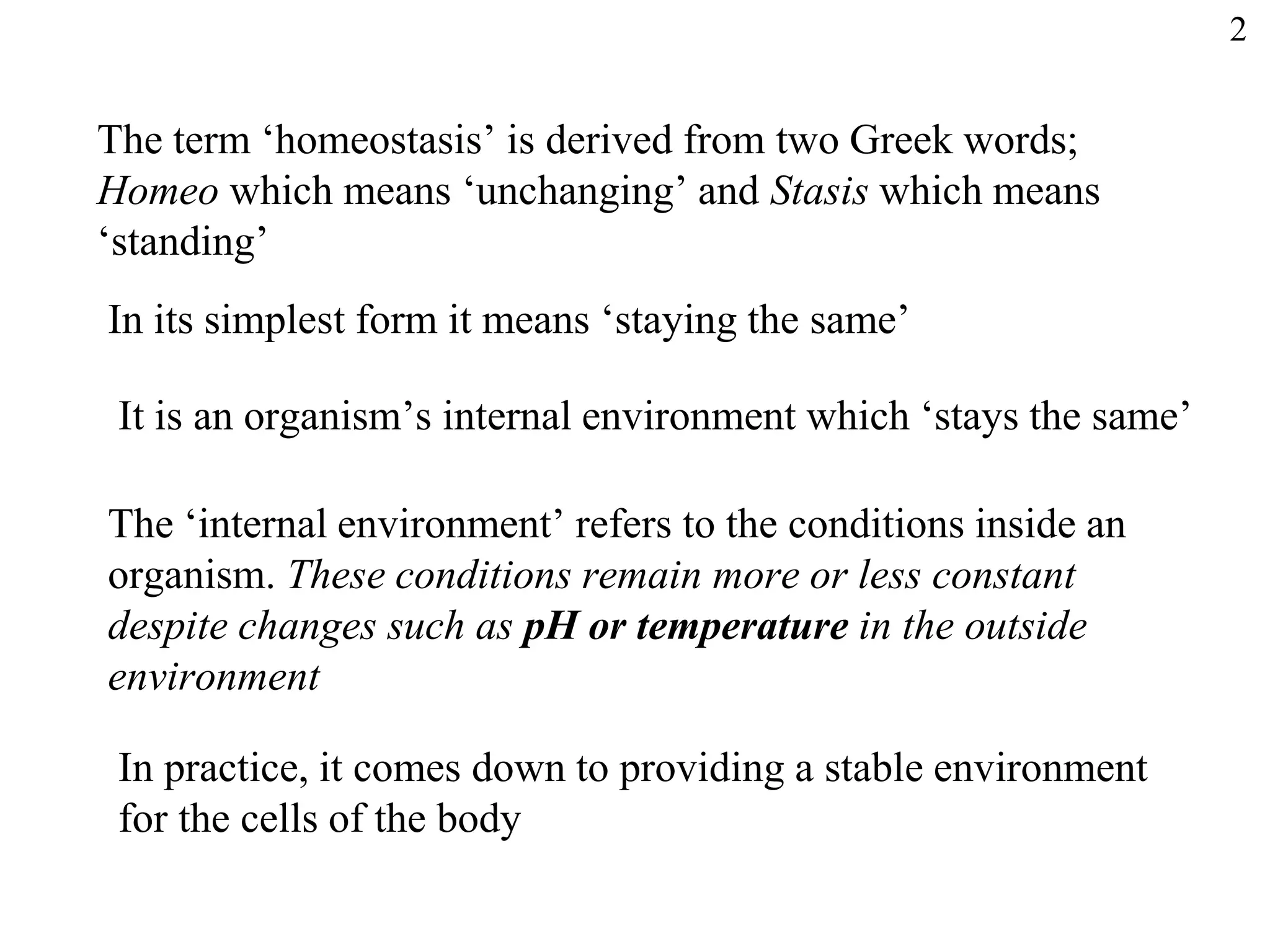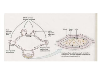 The document discusses homeostasis, which refers to the maintenance of stable internal conditions in the body despite external changes. It achieves this through negative feedback systems involving multiple organ systems. For example, temperature is regulated by sweating, vasodilation and vasoconstriction triggered by temperature sensors in the brain. Blood sugar levels are regulated by insulin and glucagon secretion from the pancreas. Kidneys also regulate fluid levels and remove wastes through processes like reabsorption and urine production.