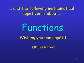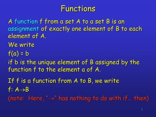 2) A function can be represented by an equation, a mapping of inputs to outputs, or a graph. Properties of functions include being one-to-one, onto, bijective, increasing, decreasing.