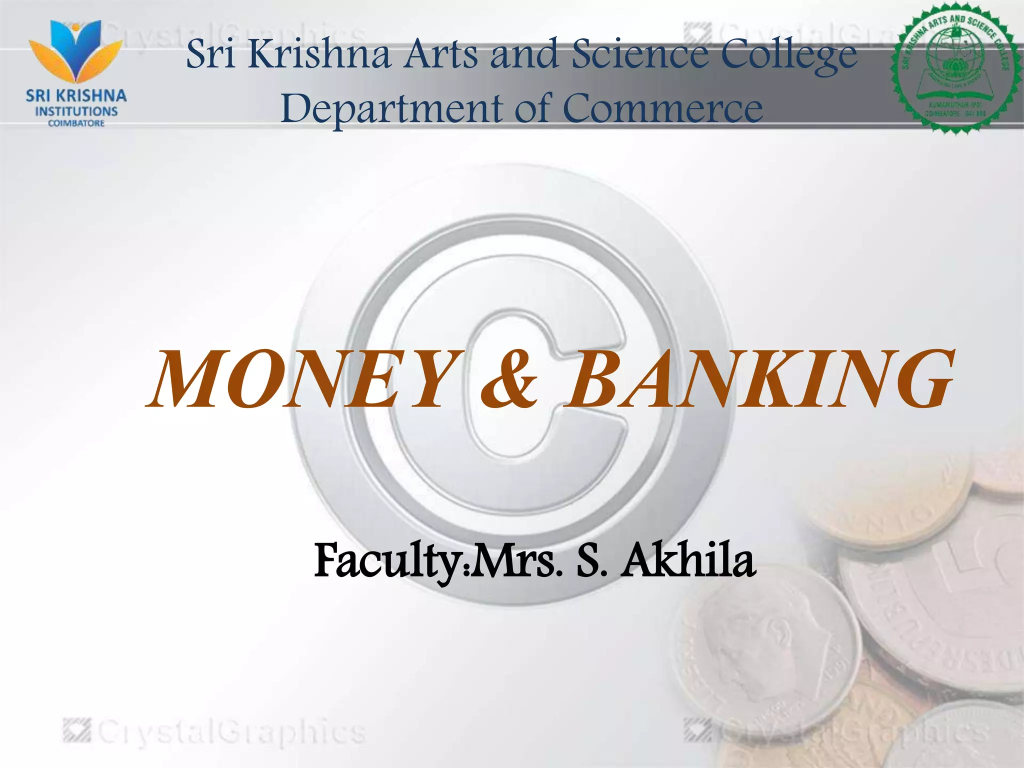 This document provides an overview of money and banking concepts. It defines money's primary functions as a medium of exchange and unit of account, and secondary functions as a store of value, standard for deferred payments, and means to easily transfer value. Money is classified as full-bodied, representative full-bodied, and credit money based on the relationship between its value as money and commodity value. Representative money includes convertible and inconvertible paper money. Credit money encompasses token coins, representative token money, circulating promissory notes, and demand deposits in banks. Key terms and characteristics of money are also introduced. The next session will cover characteristics of money in more detail.