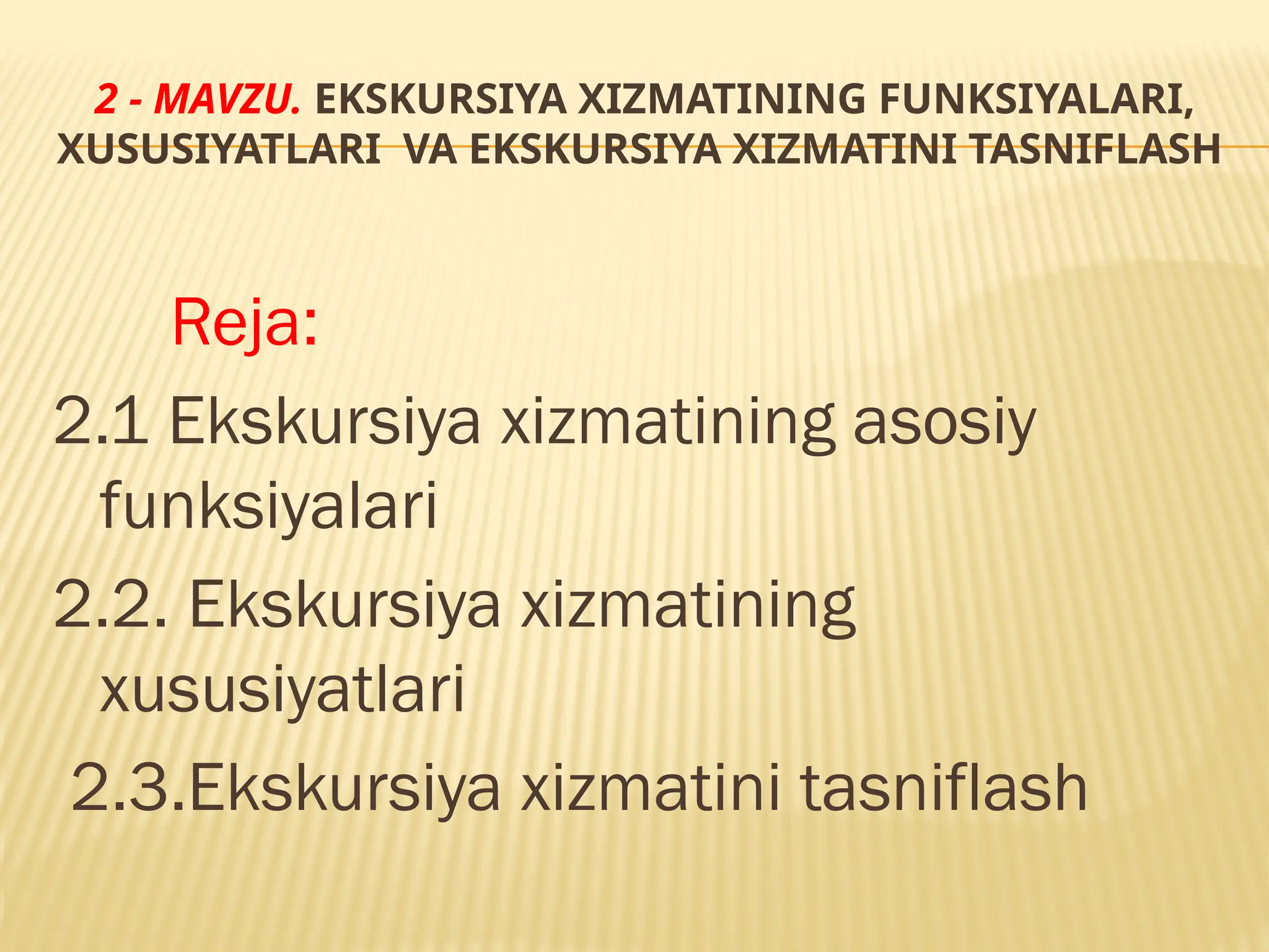 Ekskursiya xizmatio‘zining mavzusidan kelib chiqib,