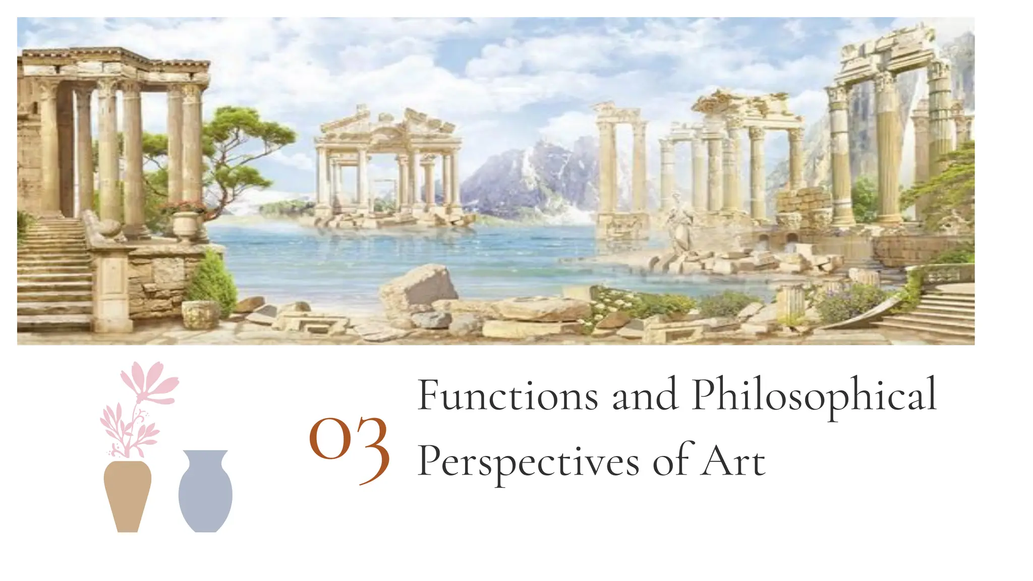 The document discusses the functions of art as defined by Aristotle, categorizing them into personal, social, and physical functions, while also noting that not all art must serve a distinct function. It presents philosophical perspectives from Plato, who viewed art as mere imitation, and Aristotle, who saw it as an aid to philosophy and a means to convey truth. Additionally, it includes insights from Kant and Tolstoy about the subjective nature of beauty and the emotional communication inherent in art.