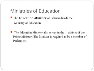 The document discusses the roles and responsibilities of education ministries in Pakistan. The Federal Ministry of Education is responsible for national education policies and coordination, while implementation falls to local administrations. Each province has its own education department. Devolution was introduced in 2000 to promote good governance, effective service delivery, transparent decision making, and distribution of resources at the district level. The primary objectives of devolving education are to involve local communities in planning, managing, monitoring, and evaluating services at the grassroots level.