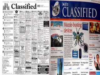 This document discusses the functions and types of advertisements. It begins by outlining the main functions of advertisements as identifying brands, providing information, persuading customers, previewing new trends, increasing demand, expanding customer bases, and influencing pricing. It then describes the main types of advertisements as print (newspaper, magazine, directory, outdoor, transit), media (television, radio, online, direct mail, mobile), territory (retail, local, national, international), and purpose (covert, brand, non-product, service, celebrities, surrogate, persuasive, competition, public service). Finally, it provides examples and further details about specific types of advertisements like newspaper, magazine, billboard, television, radio, online