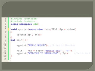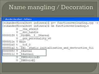 C++ functions require prototypes that specify the return type and parameters. Function overloading allows multiple functions to have the same name but different signatures. Default arguments allow functions to be called without providing trailing arguments. Inline functions expand the function body at the call site for small functions to reduce overhead compared to regular function calls.