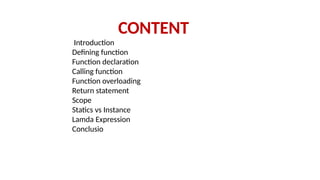 The document provides an overview of functions in Java, explaining their definition, declaration, calling, overloading, and important concepts like return statements and variable scope. It highlights the difference between static and instance methods and emphasizes the importance of mastering functions for effective programming. Overall, functions are presented as crucial for code reusability and organization in Java development.