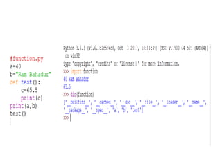 The document provides a comprehensive overview of Python functions, including their definition, purpose, and types like built-in and user-defined functions. It also covers concepts such as variable scope and lifetime, recursion with its advantages and disadvantages, and the use of lambda functions. Additionally, it explains Python modules and packages, detailing how to import them and the structure required for organizing related files.