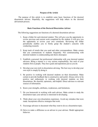 The document outlines 42 functions of a doctoral dissertation advisor. It suggests that advisors should keep organized records of each student's work, communicate frequently with students, and develop a personal but professional relationship with them. Additionally, advisors should provide constructive feedback, encourage students throughout the dissertation process, and make themselves available to students. Overall, the document provides general guidelines for advisors to help guide students successfully through completing their dissertations.