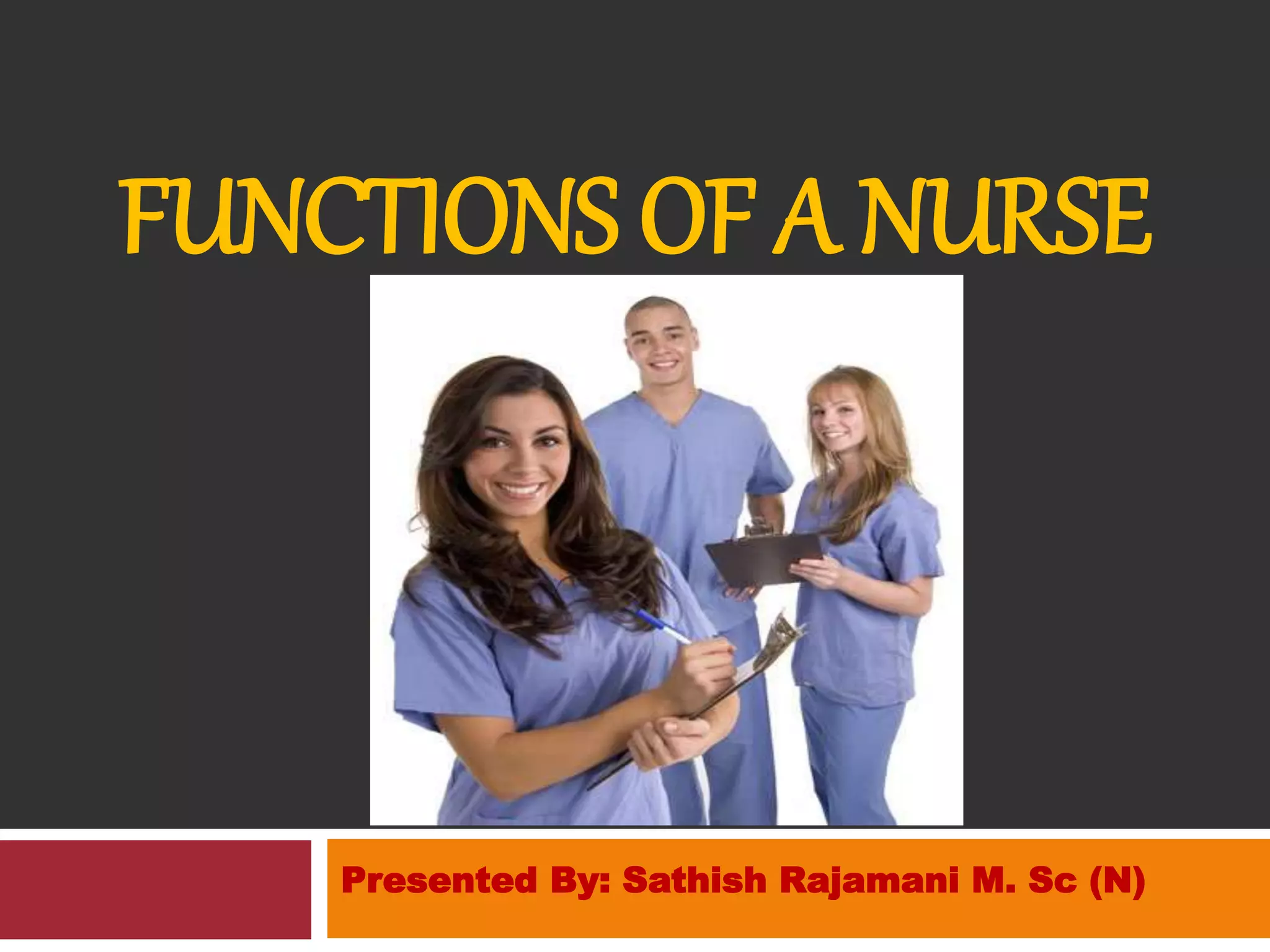 A nurse fulfills many roles including caregiver, clinical decision maker, advocate, case manager, rehabilitator, comforter, communicator, teacher, and leader. As a caregiver, the nurse helps clients regain their health through the healing process and preserves their dignity. As a clinical decision maker, the nurse uses critical thinking and collaborates with the healthcare team and clients. The nurse protects clients, asks about allergies, and ensures their legal and human rights are upheld.