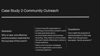 The document explores the various purposes of communication, including regulation and control, social interaction, information dissemination, emotional expression, and motivation. It highlights that communication is essential for establishing and maintaining relationships while also conveying facts and emotions. Additionally, the document suggests that communication serves to inspire and persuade others.