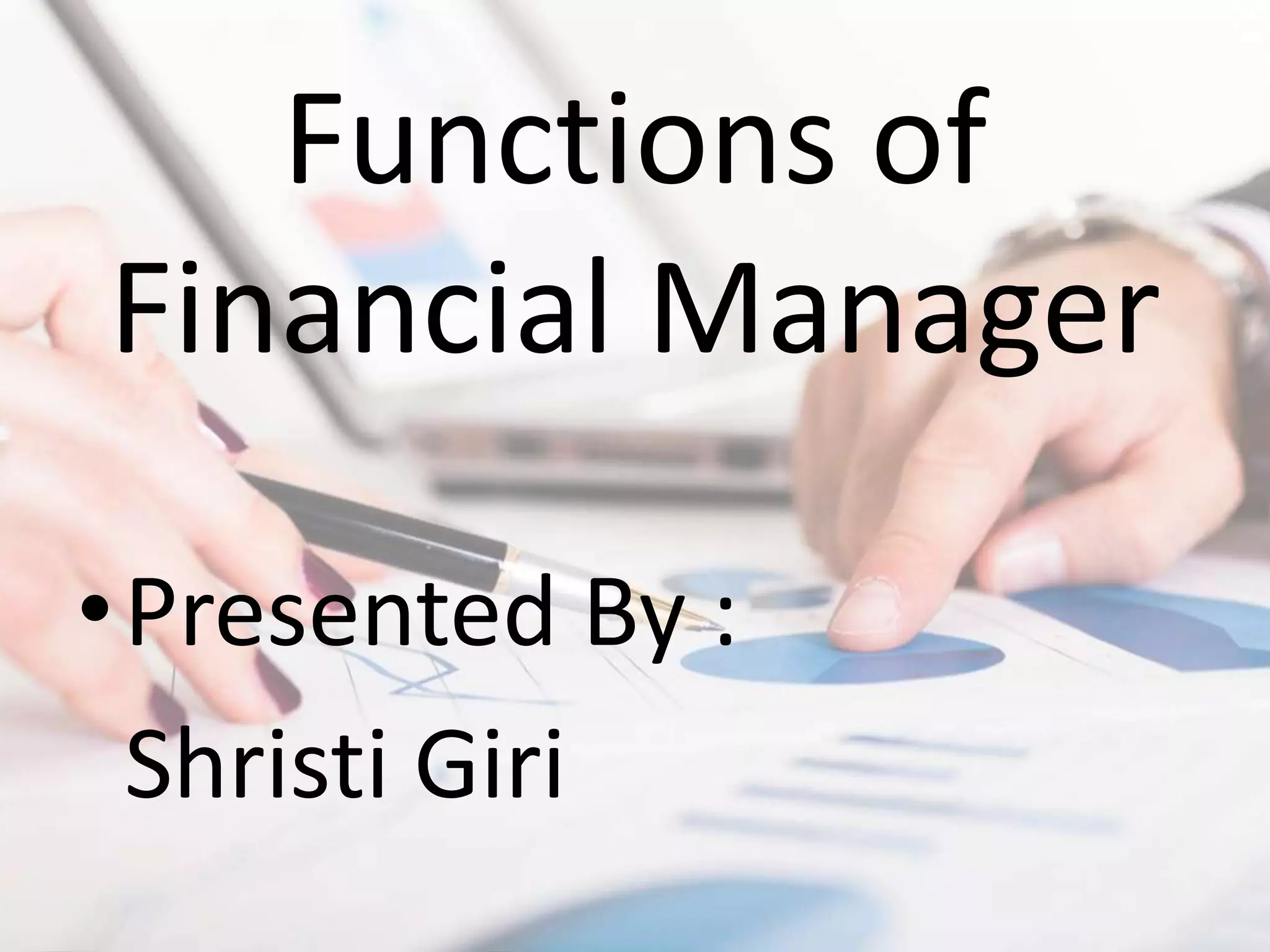 The functions of a financial manager include making investment, financing, and dividend decisions. A financial manager is responsible for the financial health of an organization by producing financial reports, directing investment activities, and developing long-term financial strategies and goals. Some of the primary roles of a financial manager are performing financial analysis and planning, deciding how to invest funds, determining the best sources of financing, and deciding how to distribute profits between shareholders and retained earnings. In addition to these core duties, a financial manager also forecasts future profits, allocates resources and funds, and represents the interests of shareholders.