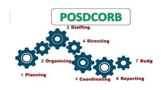 This document provides an introduction to management in nursing and outlines the management process. It discusses the key functions of management as planning, organizing, staffing, directing, coordinating, reporting and budgeting. These functions were first identified by Henry Fayol and later expanded by Luther Gulick and Lyndall Urwick in their POSDCORB model of the management process. The document then provides further details on each of the management functions.
