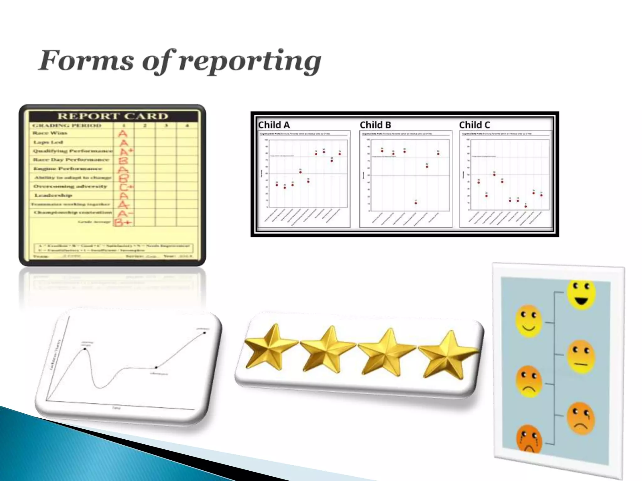 The document outlines the functions and importance of reporting systems in education, defining reporting as a process of conveying results to stakeholders like parents and teachers. It details various forms of reporting, including report cards, rating scales, grades, marksheets, and graphical formats, while emphasizing the role of reporting in enhancing student learning and fostering relationships among stakeholders. Additionally, the reporting system helps identify individual strengths and weaknesses, facilitating improved performance.