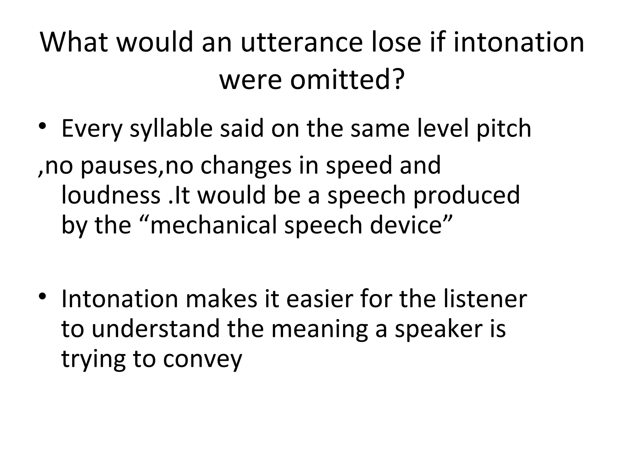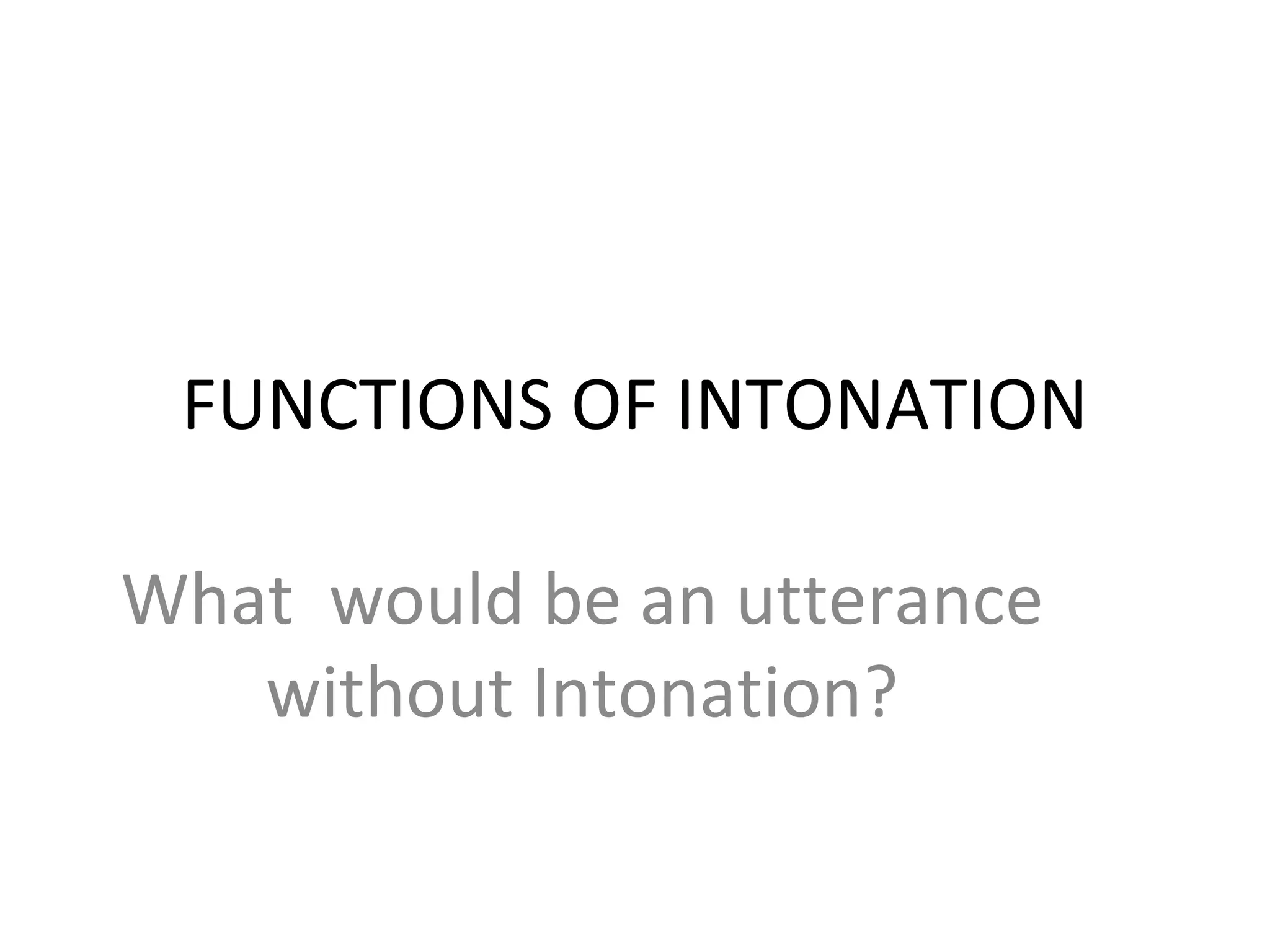 Intonation serves several important linguistic functions in spoken language. It helps convey meaning through attitudes, marks a speaker's identity, determines stress patterns, clarifies grammar and syntax, and aids in segmenting information for listeners. Intonation allows speakers to express attitudes, regional identities, and indicates new information through stress. It also helps distinguish statements from questions and different types of sentences.