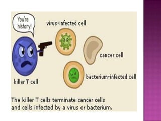The document provides a comprehensive overview of the human immune system, highlighting the roles of various cells such as T cells, B cells, and their functions in immune responses, including self-activation and antibody production. It also discusses autoimmune disorders, immune deficiencies, and the impact of conditions like HIV/AIDS on the immune system. Additionally, it covers prevention strategies and the implications of lymphocyte count abnormalities.