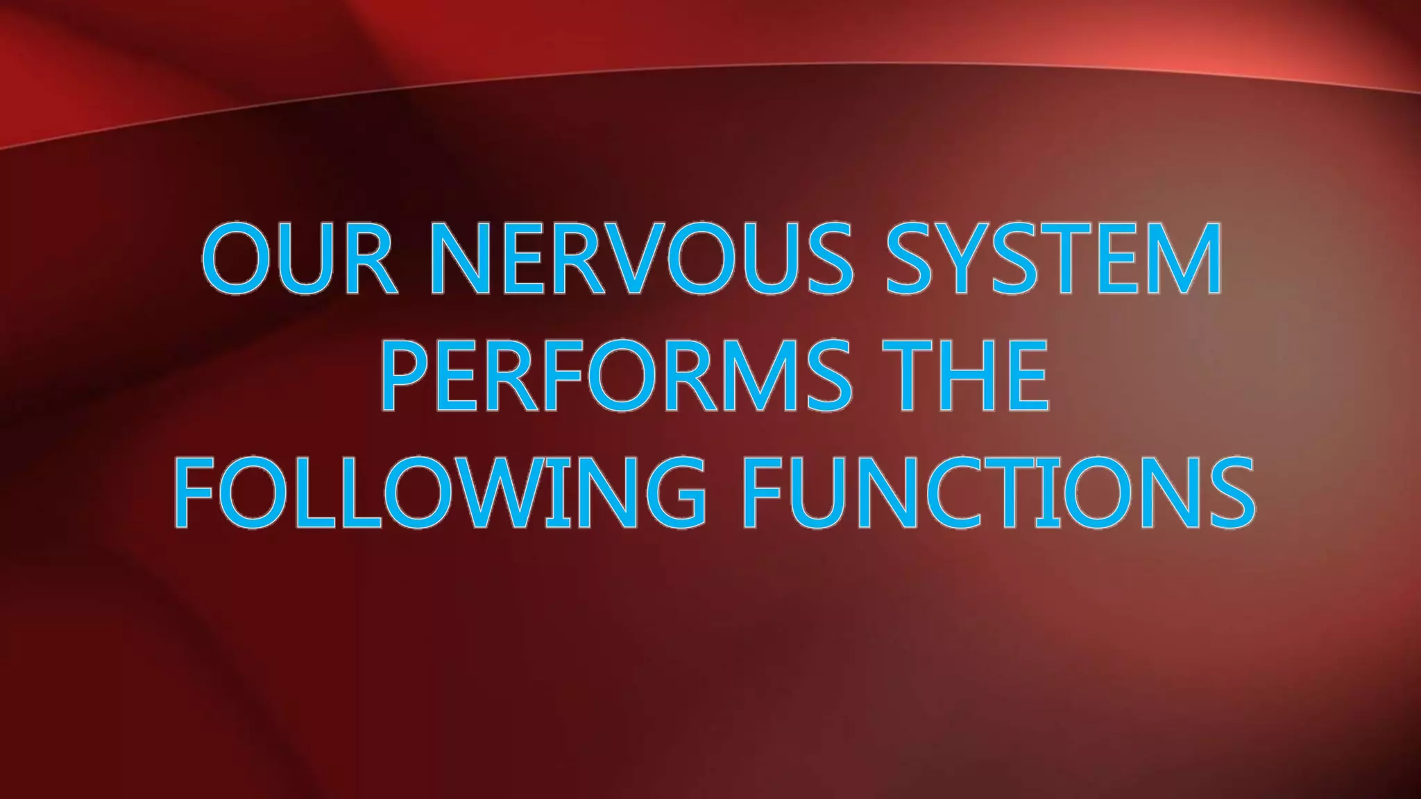 The nervous system has several important functions: 1. It regulates and coordinates the activities of all body organ systems. 2. It governs conscious activities like thinking, reasoning, and learning. 3. It is responsible for emotions like love, anger, and fear. 4. It controls involuntary functions of some organs like heartbeat, breathing, and digestion. 5. It helps interpret and respond to messages from the senses. 6. It is responsible for reflex actions.
