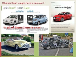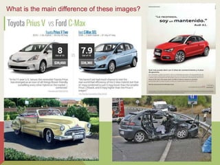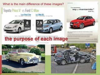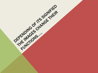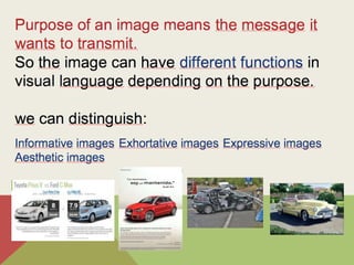 The visual communication process involves the production, transmission, and receipt of messages through images. It includes key elements like the context, sender, message, receptor, code or language, and channel or medium. An image functions as the main vehicle for visual communication, transmitting information through its signifier (visual content) and signified (intended meaning). The meaning of an image depends on the context and is open to interpretation based on one's perceptions. Visual language serves informative, exhortative, expressive, and aesthetic functions depending on the message an image aims to convey. Pictograms are simplified symbolic images that convey meaning through basic shapes and forms.